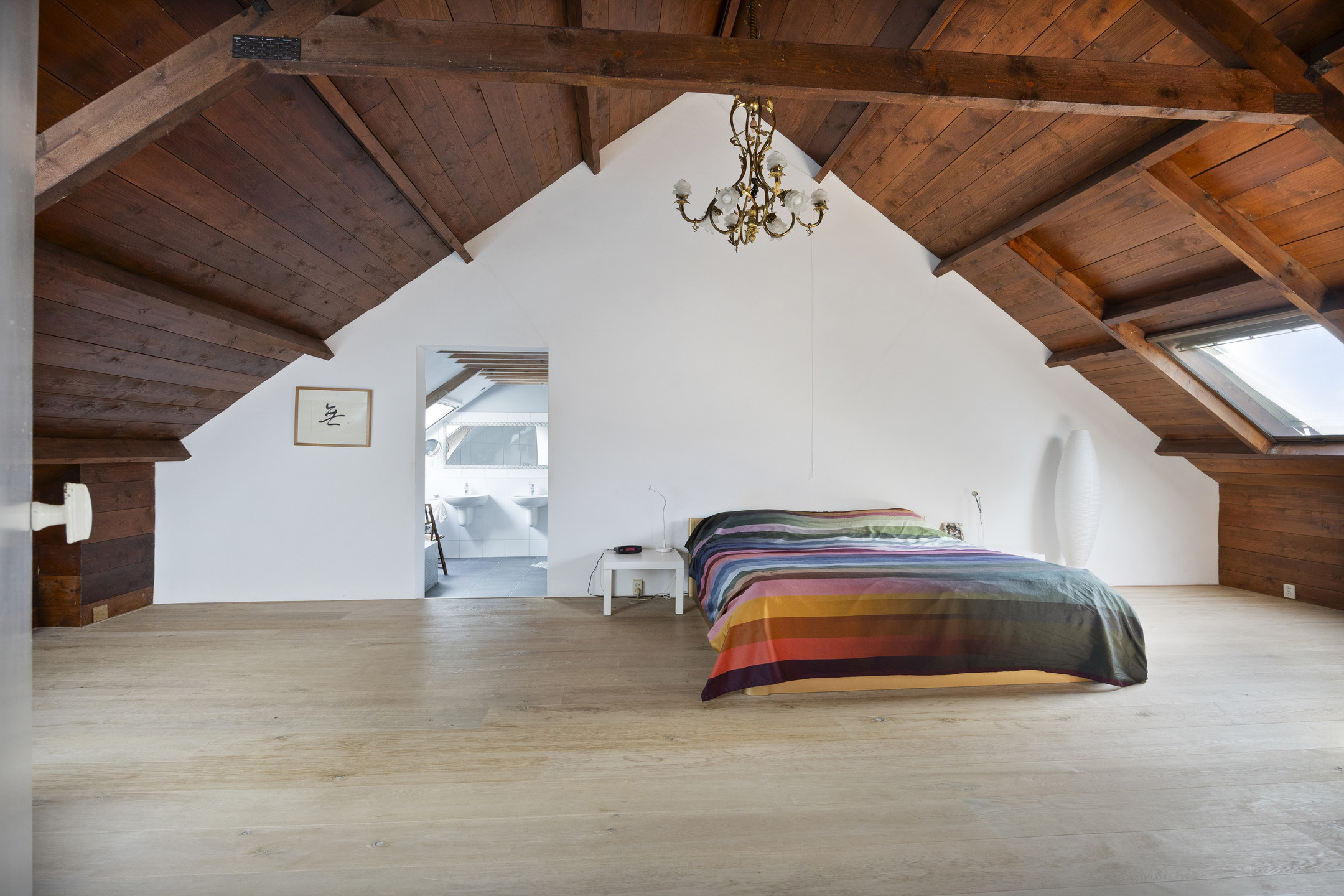 hoofdslaapkamer met een 3-tal dakramen, wandafwerking stucwerk, laminaatvloer met eiken bovenlaag, fraai zicht op de houten balkenconstructie, inloopkast vv. omvormer en een dakraam;