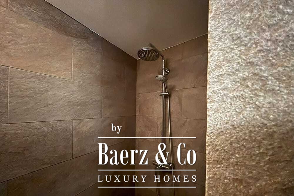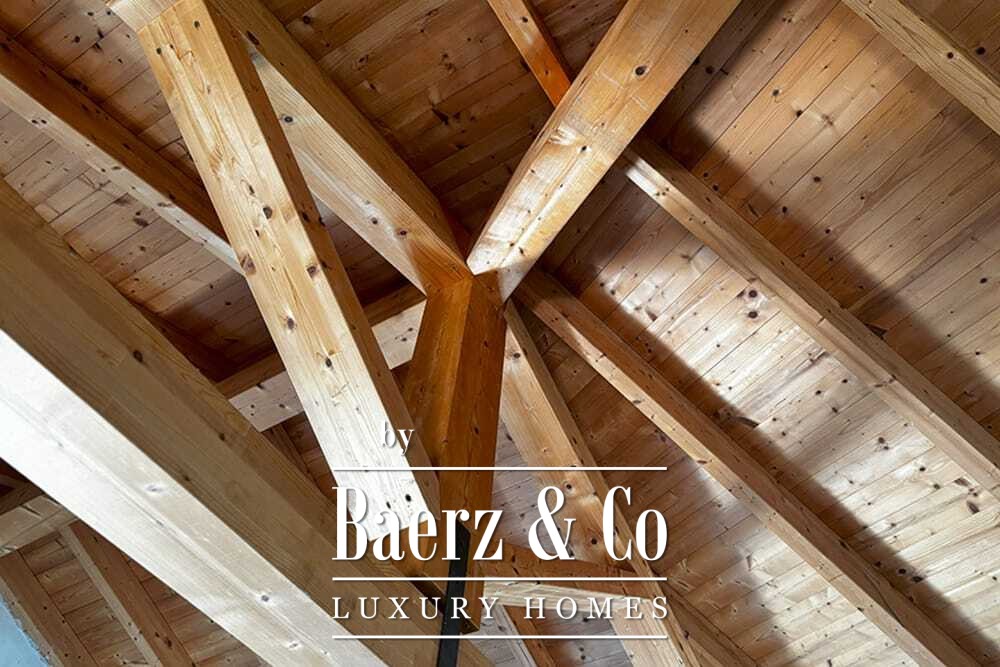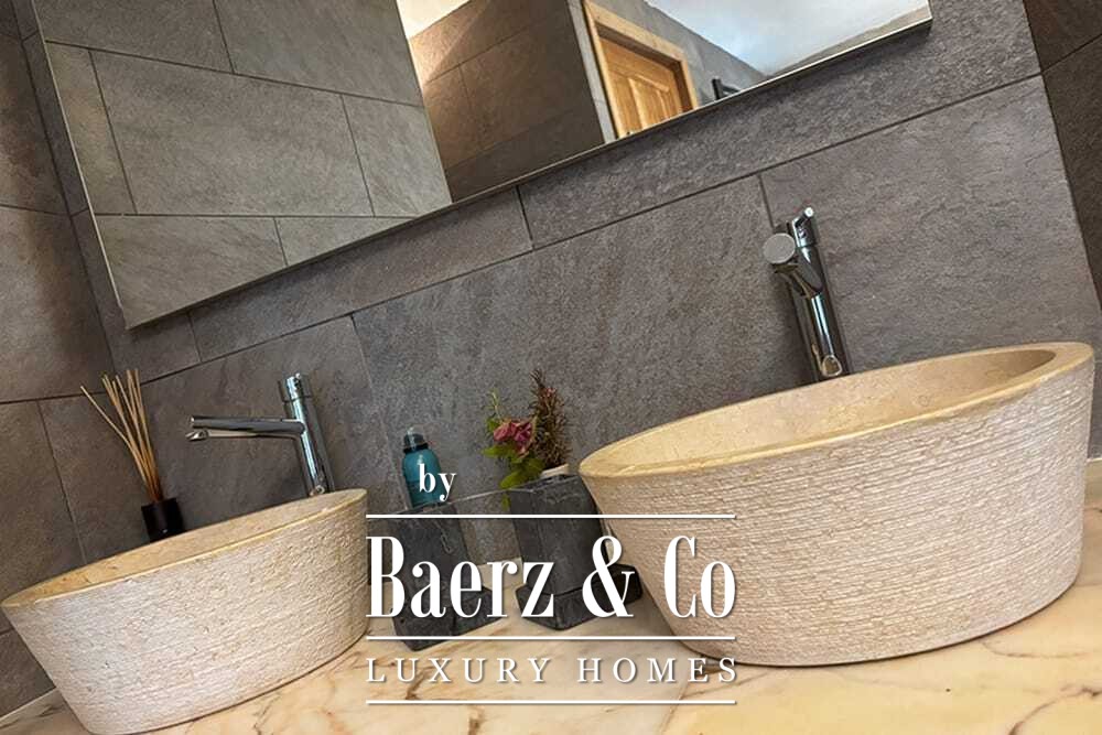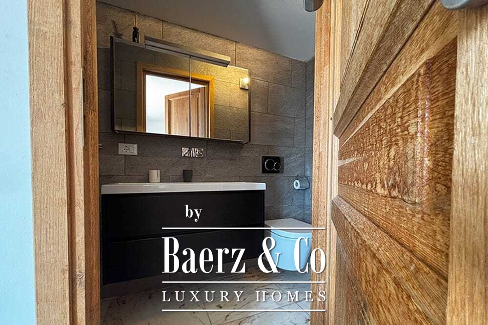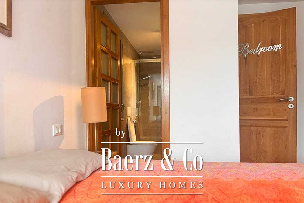 На двух этажах расположены четыре спальни и четыре ванные комнаты. Три спальни на первом этаже имеют французские двери с выходом на нижнюю террасу и виды на горы. Главная спальня включает просторную ванную комнату с отдельной душевой, двумя мраморными раковинами и дизайнерскими аксессуарами, создающими атмосферу уединения. Спальная студия с отдельным входом повышает удобство размещения гостей или организации рабочего пространства. На втором этаже — гостиная с открытыми балками и камином, переходящая в кухню из ореха и нержавеющей стали с техникой Miele премиум-класса. Высокие стеклянные двери ведут в лаунж с вторым камином и выходом на террасы, оформленные гранитными столами и стульями Philippe Starck.