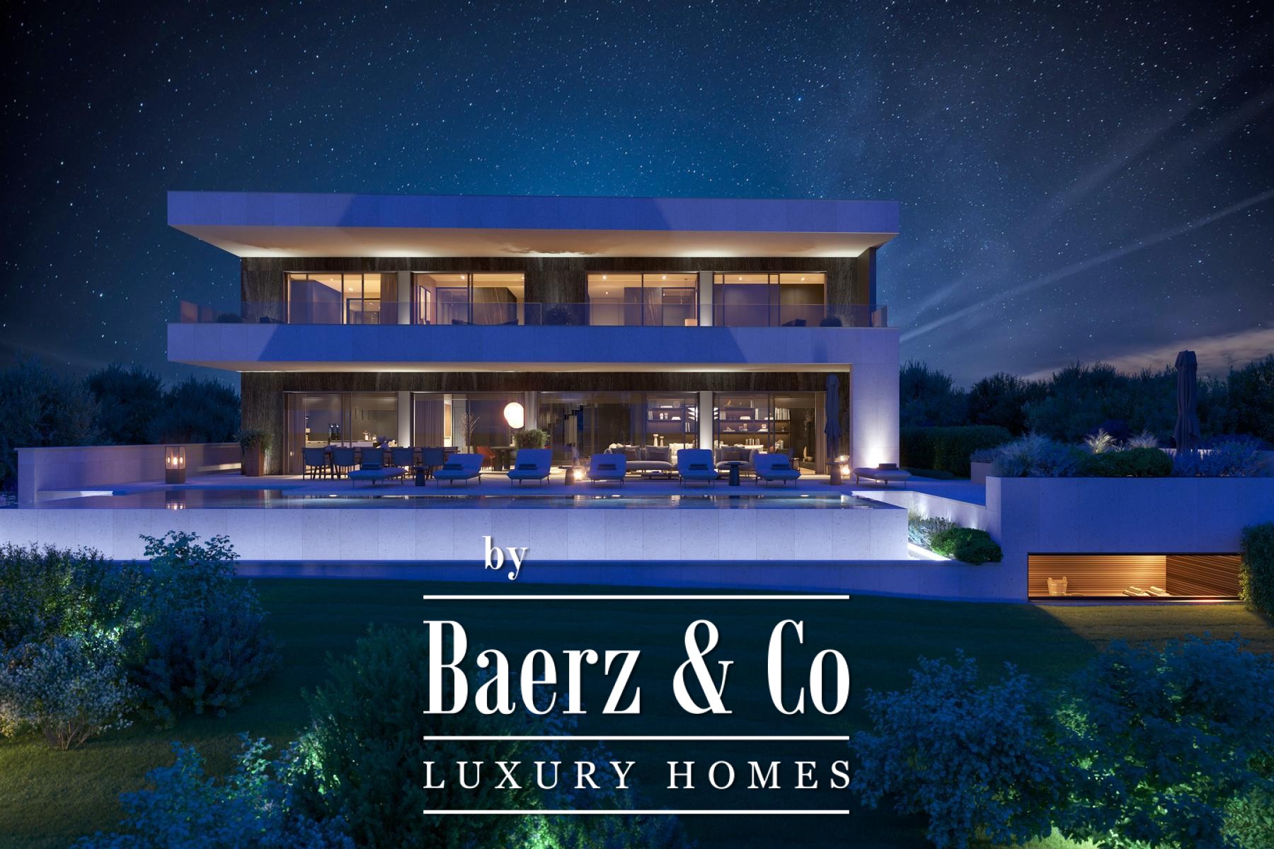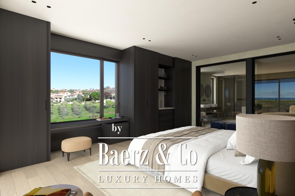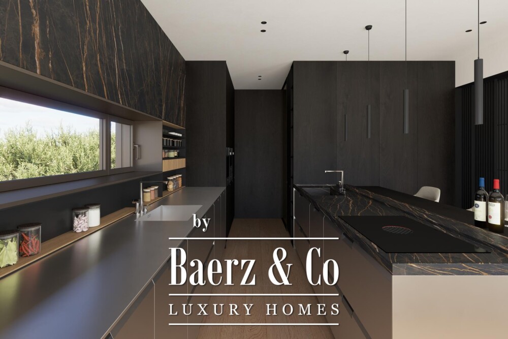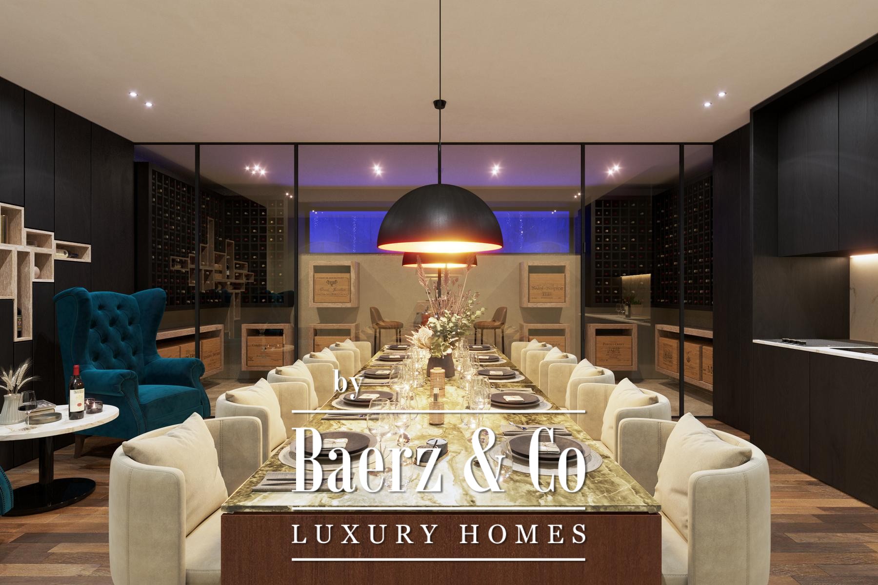 На верхнем уровне две мастер-сьюты и ещё две спальни, каждая с собственной ванной комнатой и выходом на крытую террасу с видом на Адриатику. Подвал не уступает по продуманности: просторный гараж на три автомобиля, кладовая, два технических помещения, прачечная, оздоровительный блок с джакузи и сауной, а также винный погреб для неформальных встреч.