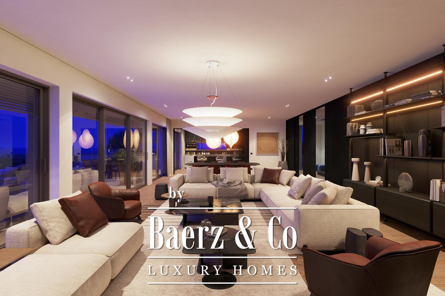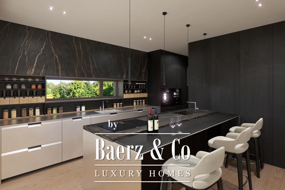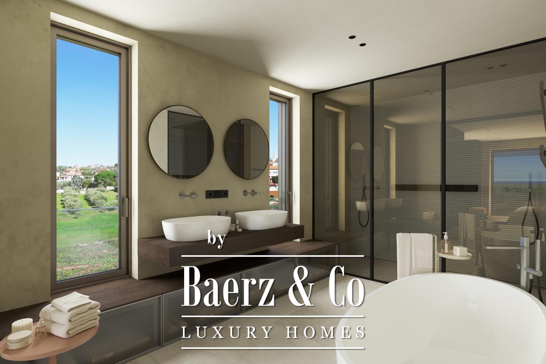На верхнем уровне две мастер-сьюты и ещё две спальни, каждая с собственной ванной комнатой и выходом на крытую террасу с видом на Адриатику. Подвал не уступает по продуманности: просторный гараж на три автомобиля, кладовая, два технических помещения, прачечная, оздоровительный блок с джакузи и сауной, а также винный погреб для неформальных встреч.
