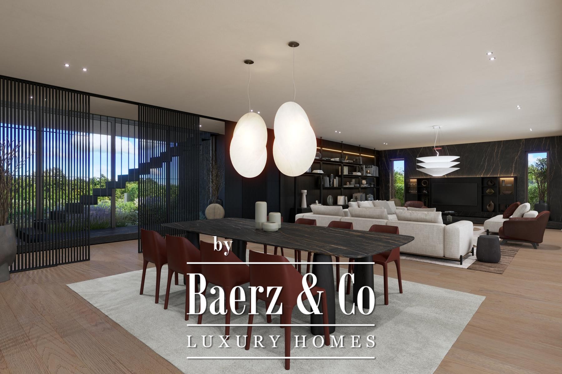 На первом этаже кухня, столовая и гостиная образуют единое пространство с плавными переходами. Широкие стеклянные двери открывают выход на крытую террасу, зону для загара и инфинити-бассейн площадью 67,04 м². Рядом находится сауна, располагающая к уединённому отдыху, а просторные гостевые помещения идеально подходят для изысканных приёмов.