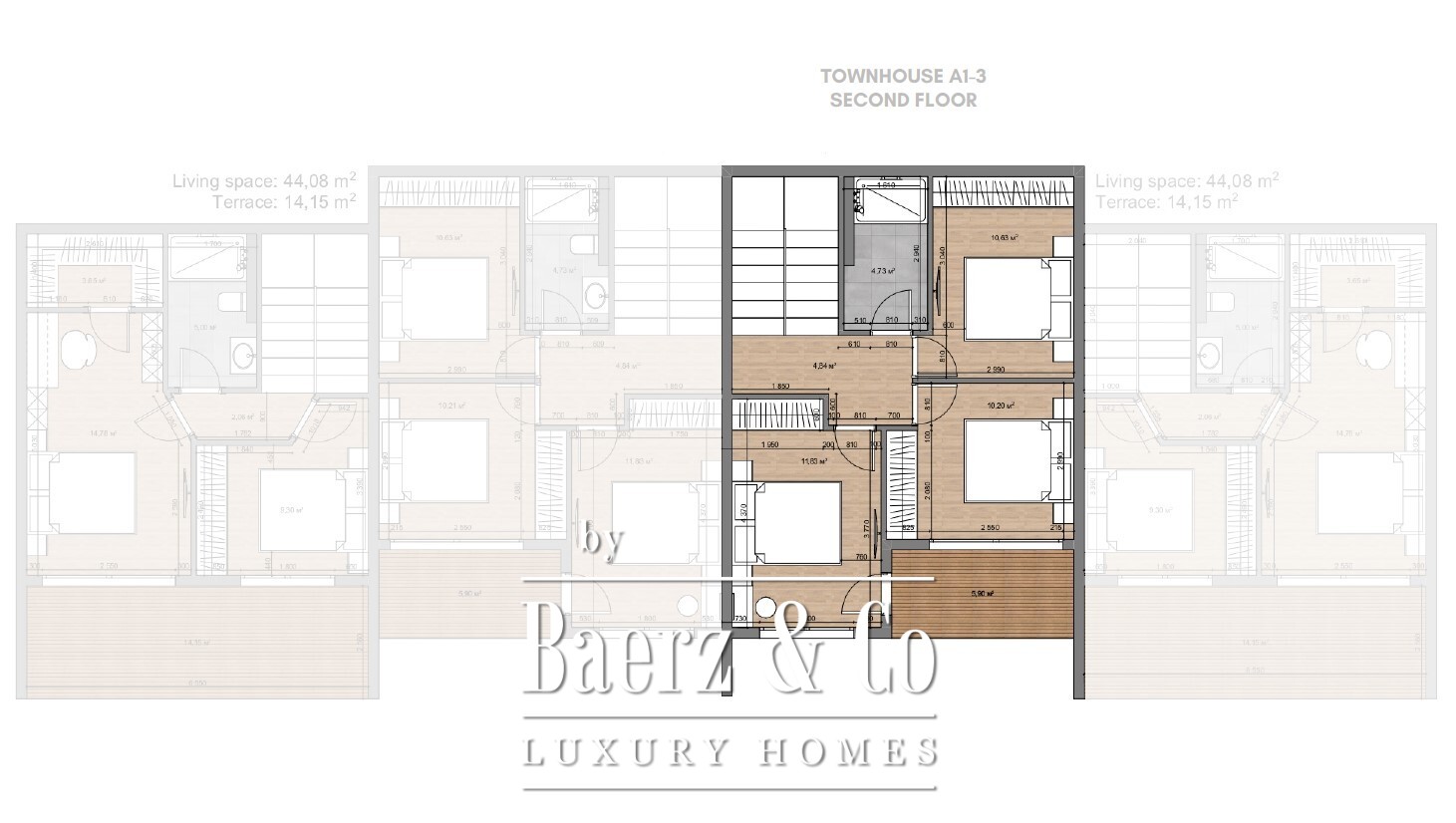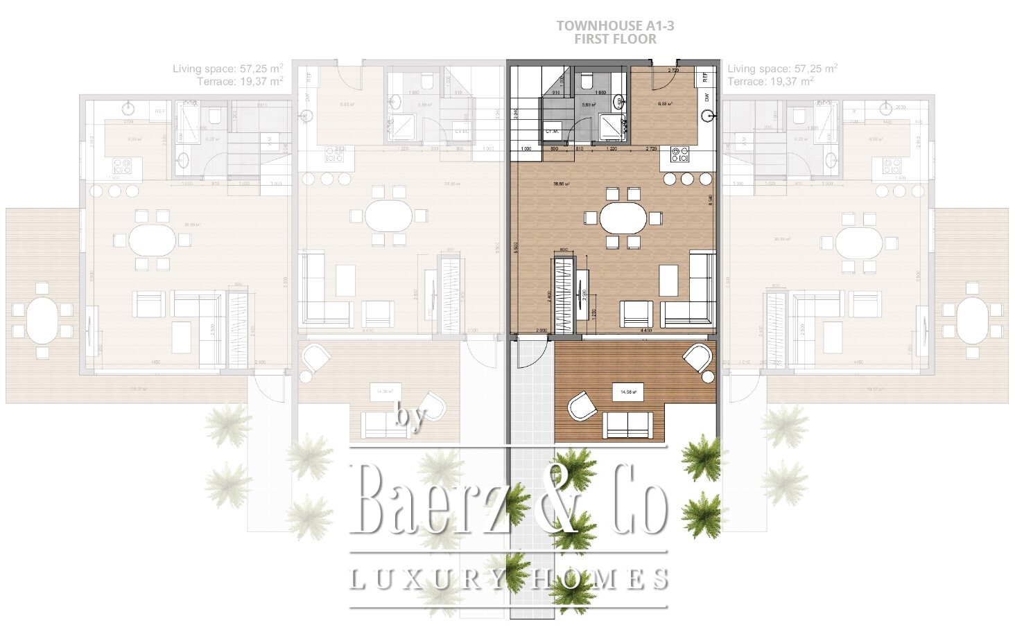 Площадь резиденции составляет 110 м² на приватном участке 200 м², с возможностью планировки на две или три спальни и две ванные комнаты. Просторная гостиная с кухней открытой планировки выходит на две террасы с видами на море. Наличие парковочного места и частной пешеходной дорожки подчеркивает индивидуальность дома. Каждая структура townhouse объединяет четыре дома, выполненных из современного железобетона с ударопрочными панорамными окнами и с акцентом на экологическую безопасность.