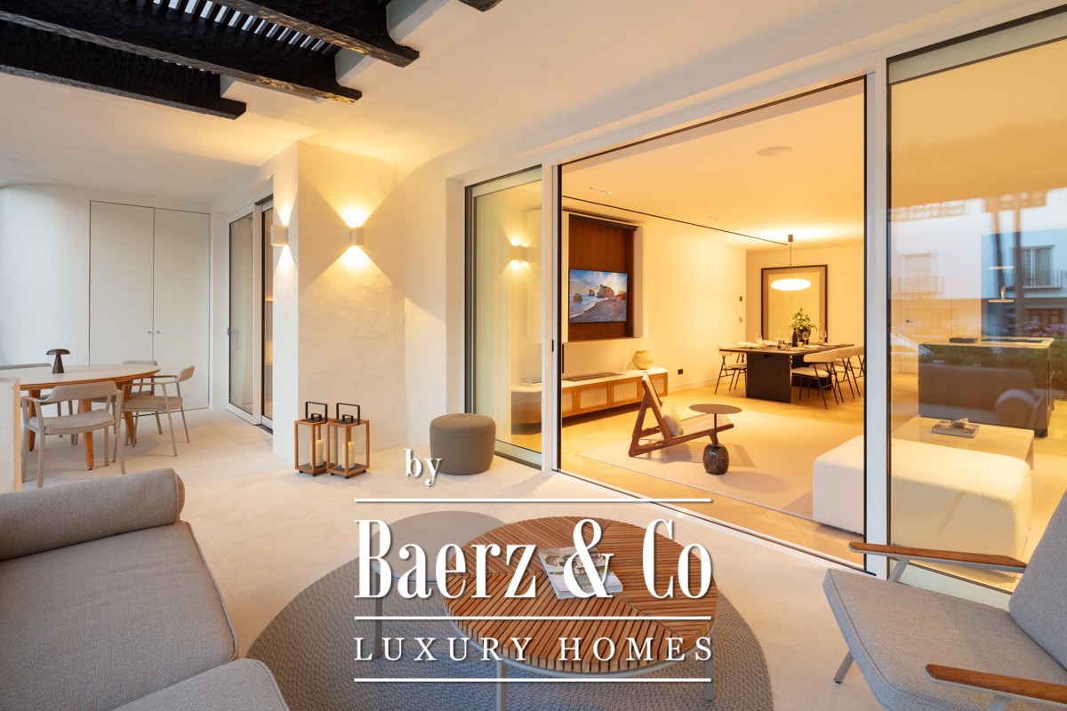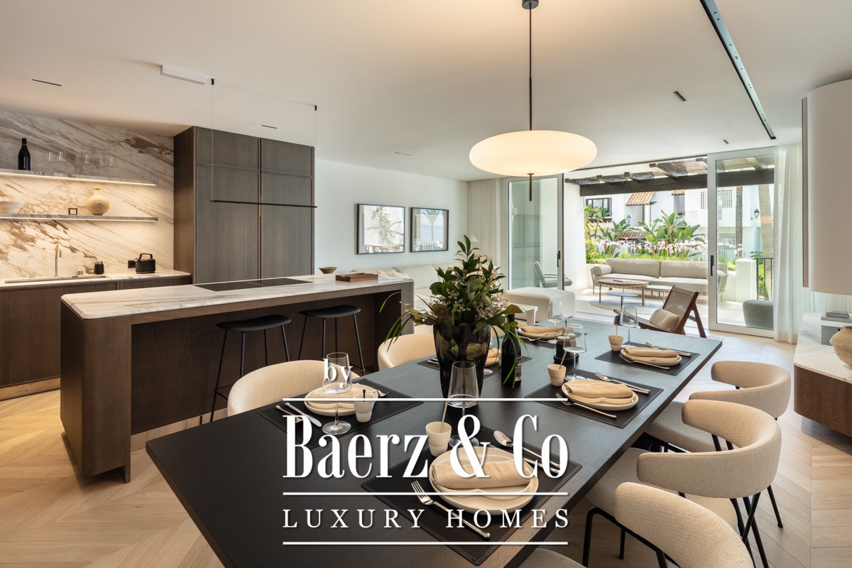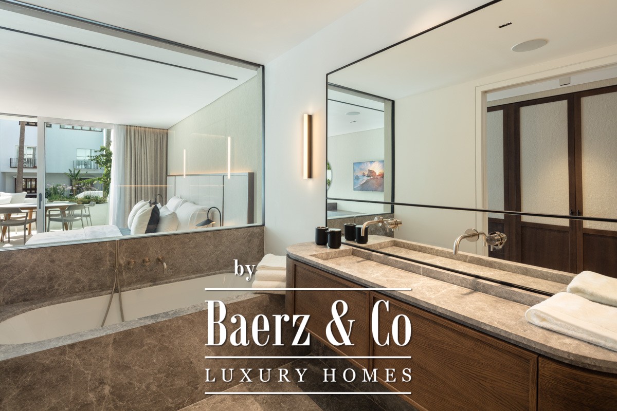 Апартаменты Marbella Golden Mile расположены в комплексе Puente Romano Resort, где свет и морской бриз формируют атмосферу спокойной утончённости. Эти апартаменты площадью 138 м² предлагают светлую открытую гостиную зону, объединённую с террасой, общим садом и видом на побережье благодаря панорамным стеклянным дверям от пола до потолка. Сочетание нейтральной цветовой гаммы и натурального дерева на полу отражает средиземноморский ландшафт, создавая ощущение гармонии в жилых и приватных пространствах.