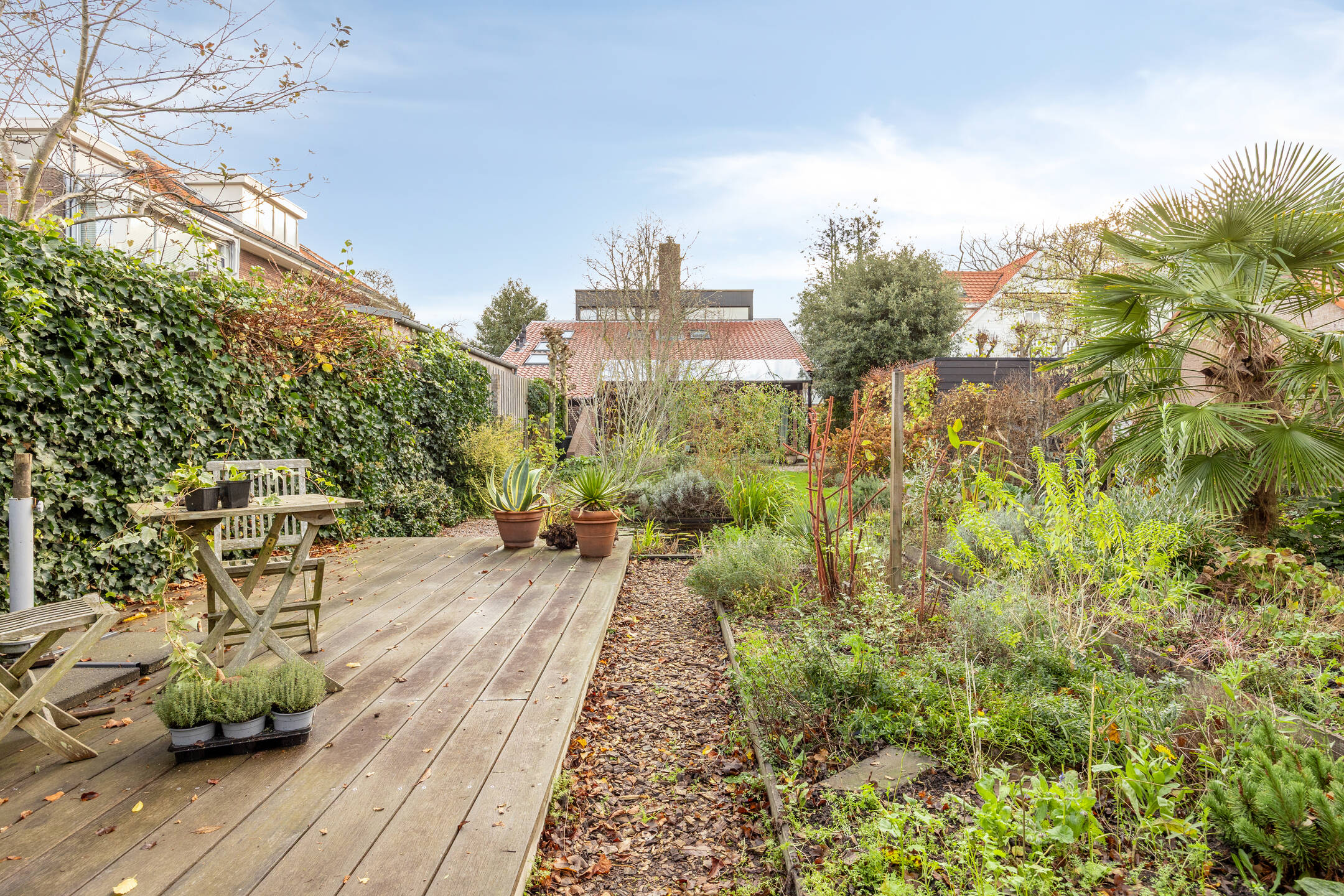 Через остеклённый боковой вход попадаешь в наполненную светом современную кухню, оснащённую индукционной варочной панелью, газовой конфоркой для вок и высококлассной техникой. Планировка открытого типа объединяет кухню с гостиной, где большие стеклянные раздвижные двери, высокие потолки и центральный камин наполняют пространство светом и спокойствием. Стеклянная веранда сзади продлевает сезоны и создаёт визуальную связь с садом, глубиной более 30 метров и ориентацией на запад-северо-запад, где обильно растёт местная зелень и встречается живая природа.