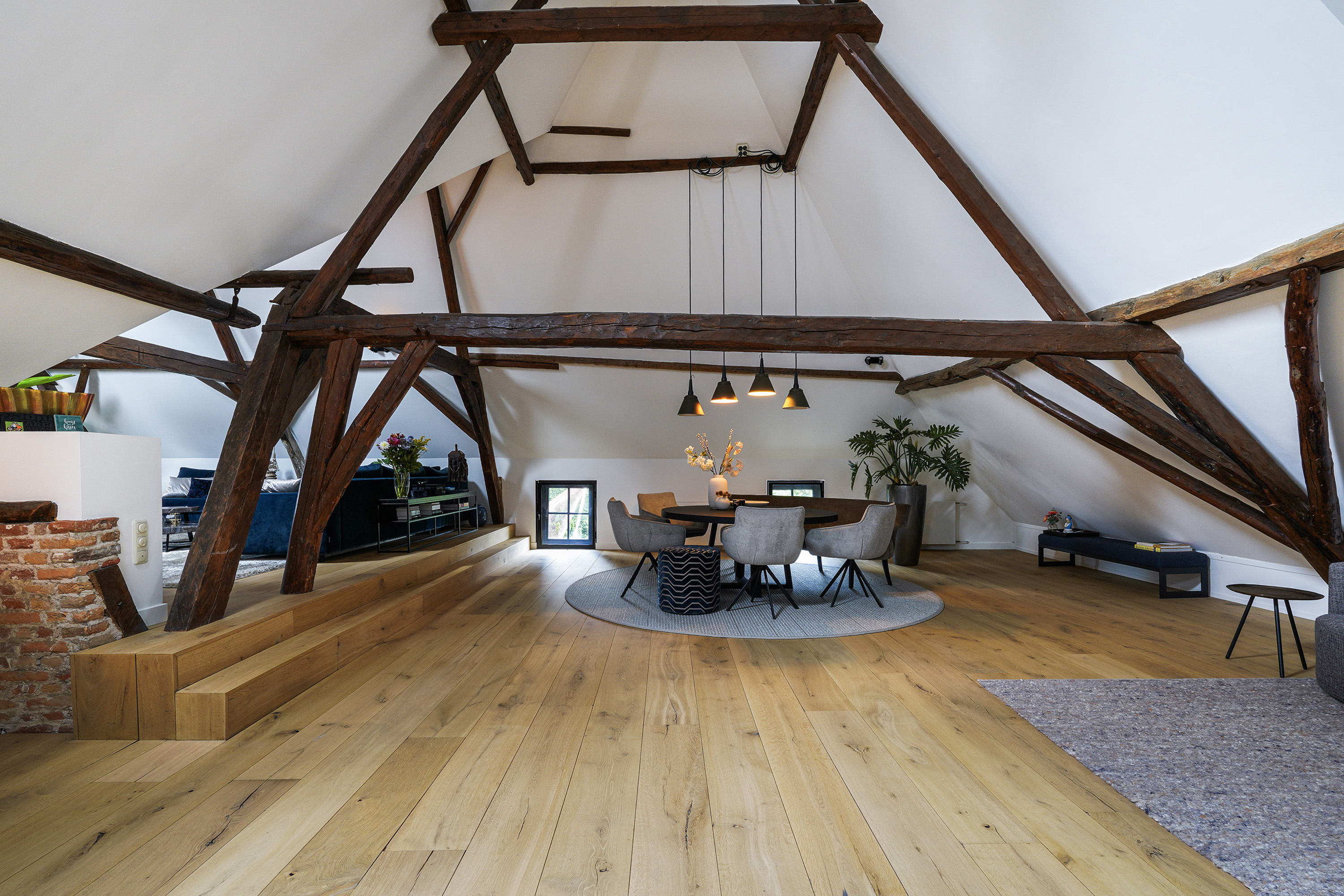 七间卧室与四间卫浴分布合理,一层设有三套独立套房,目前布局为成功运营的民宿(Bed & Breakfast),每间均配独立入口与卫浴。主居住宅理想适合作为多世同堂的私密生活空间,或继续经营成熟的接待业务。五套独立供暖系统、防火隔热茅草屋顶、双层隔热玻璃及地暖等现代舒适设施悉数配备,近期翻修亦充分尊重宅邸的历史风貌与受保护身份。