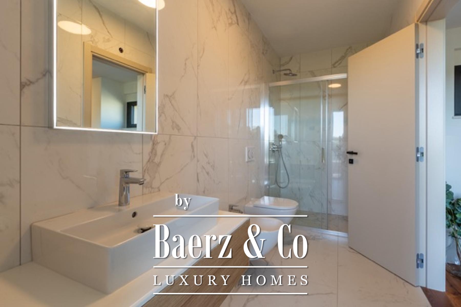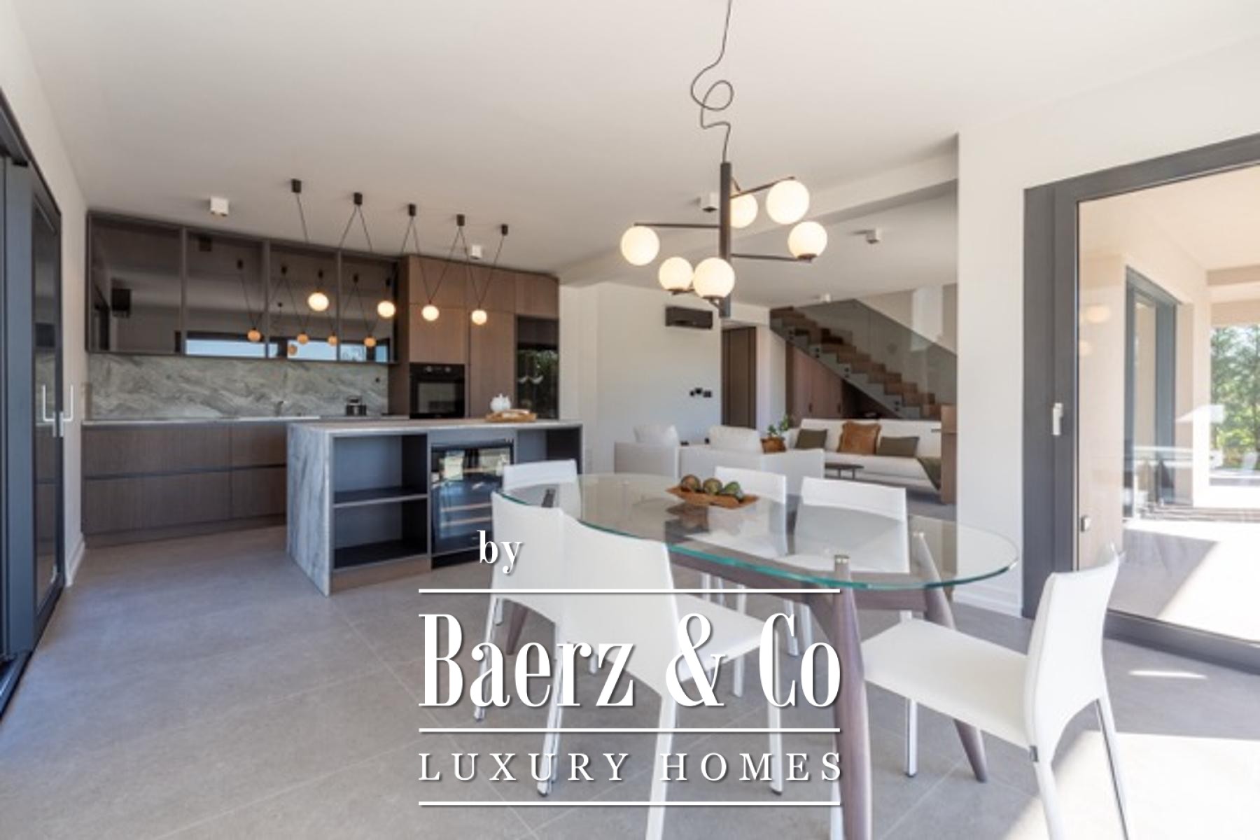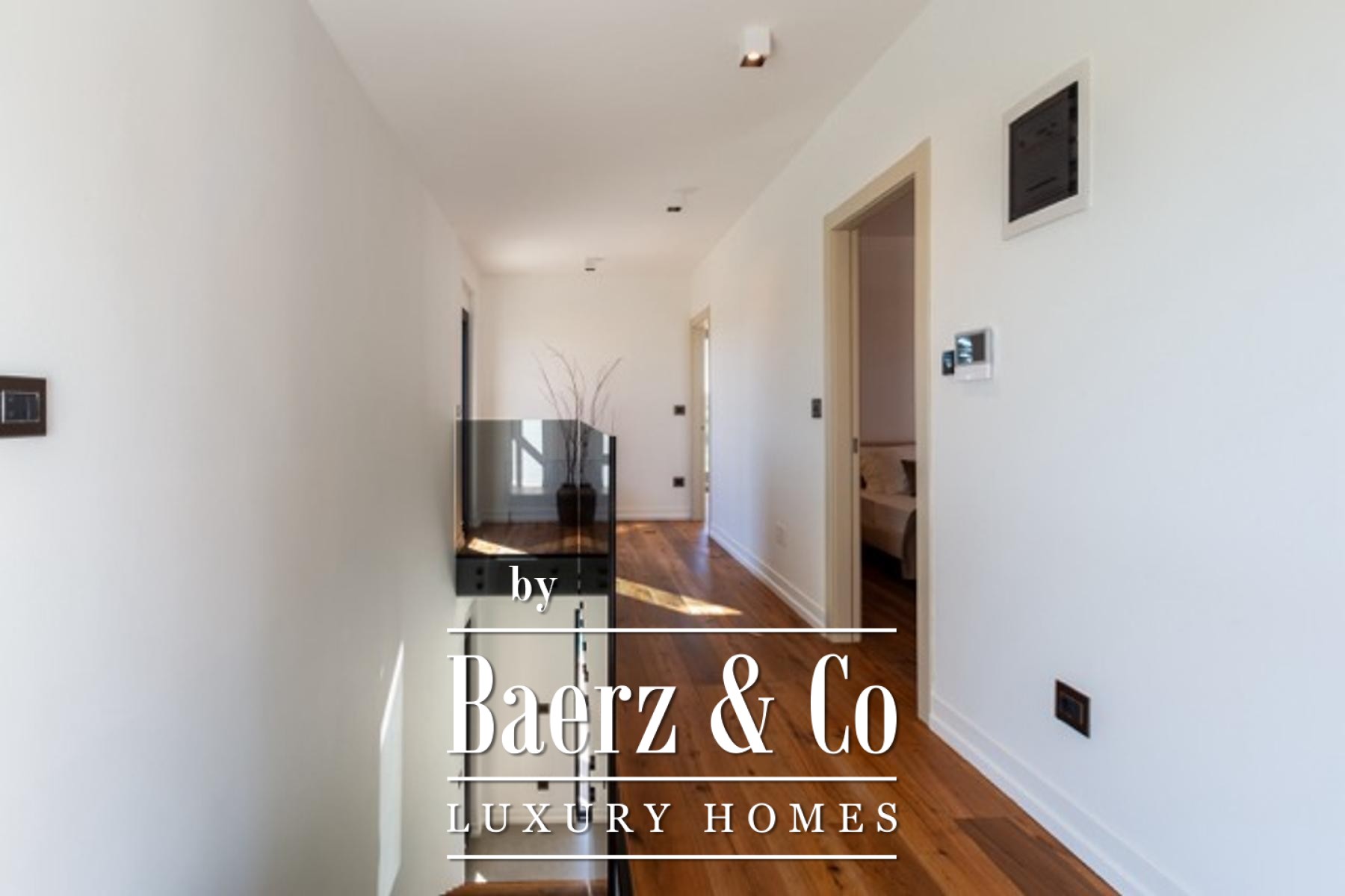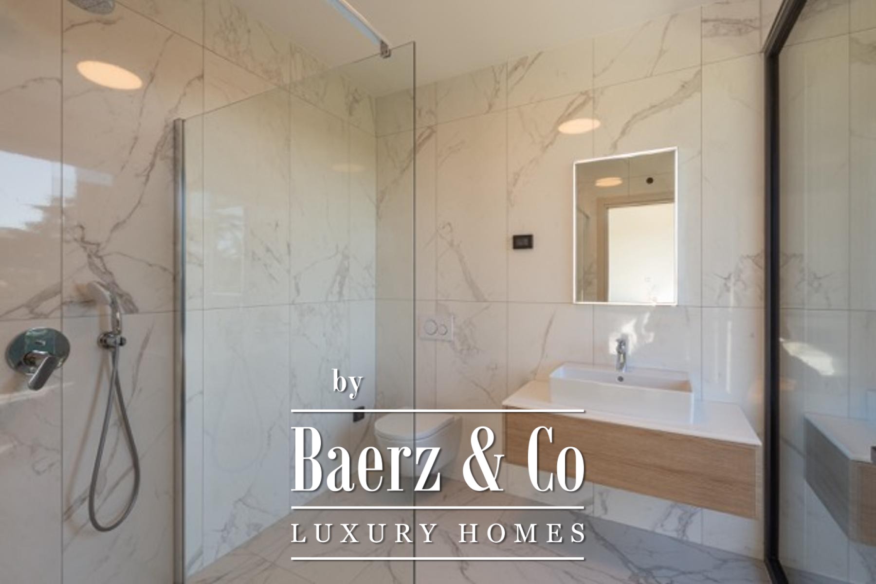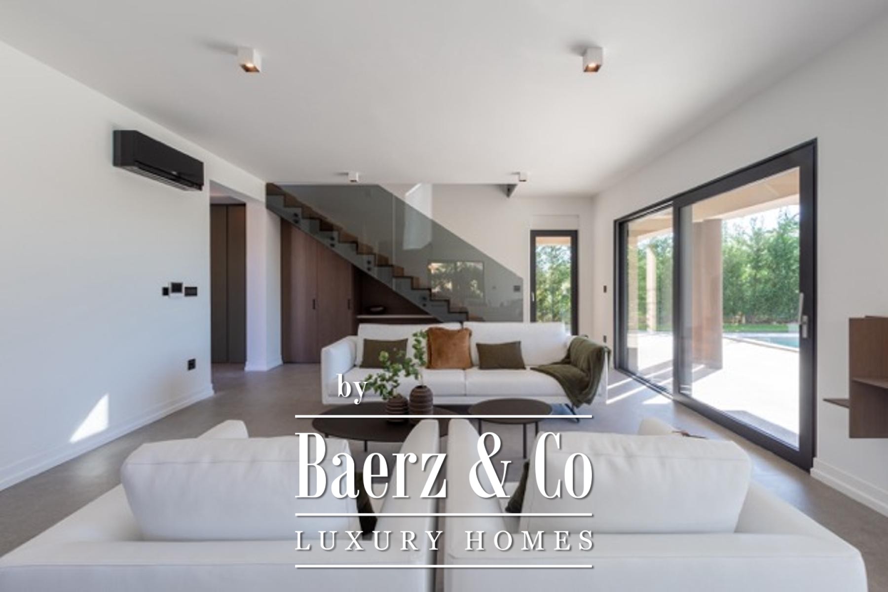 步入室内,高挑的天花板与开放式布局营造出开阔而明亮的空间。落地玻璃令精心修整的花园与9.5米乘3.5米的恒温泳池尽收眼底。主层与户外空间自然衔接,自动灌溉系统保持庭院的静谧氛围。居所中心设有玻璃楼梯,通往三间配套现代浴室的卧室,其中两间卧室设有专属露台,为午后静谧时光提供理想场所。